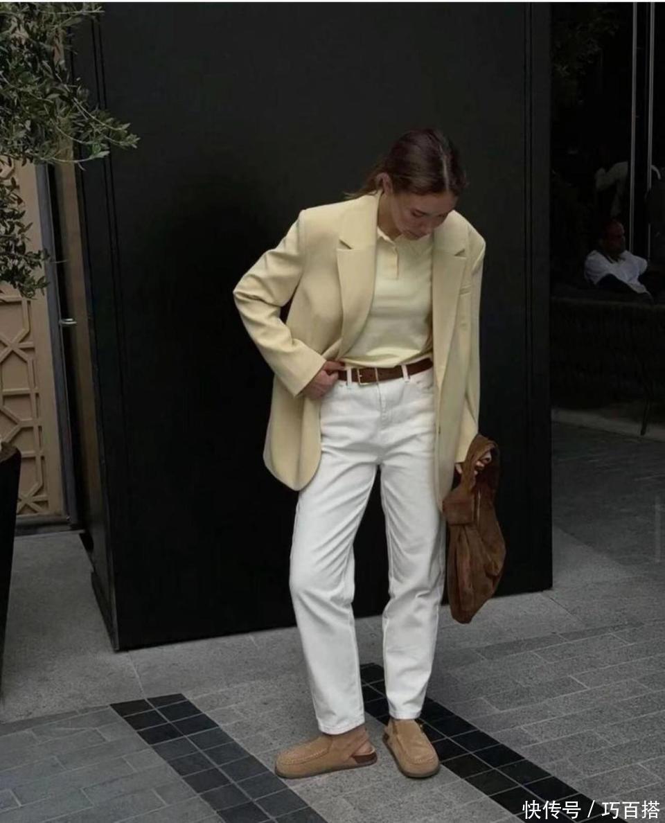 白色纯棉T恤搭配白色雪纺裤,通过面料差异区分层次,简单利落有性价比,奶油白针织衫搭配米白色牛仔裤,冷暖色调叠加温柔又内敛。