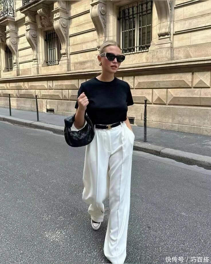 也可以选择黑色上衣+白色长裤的组合模式,非黑即白的上身效果,精简时髦又不影响观感,黑色衬衫、黑色皮衣等与白色长裤搭配,效果也不赖。